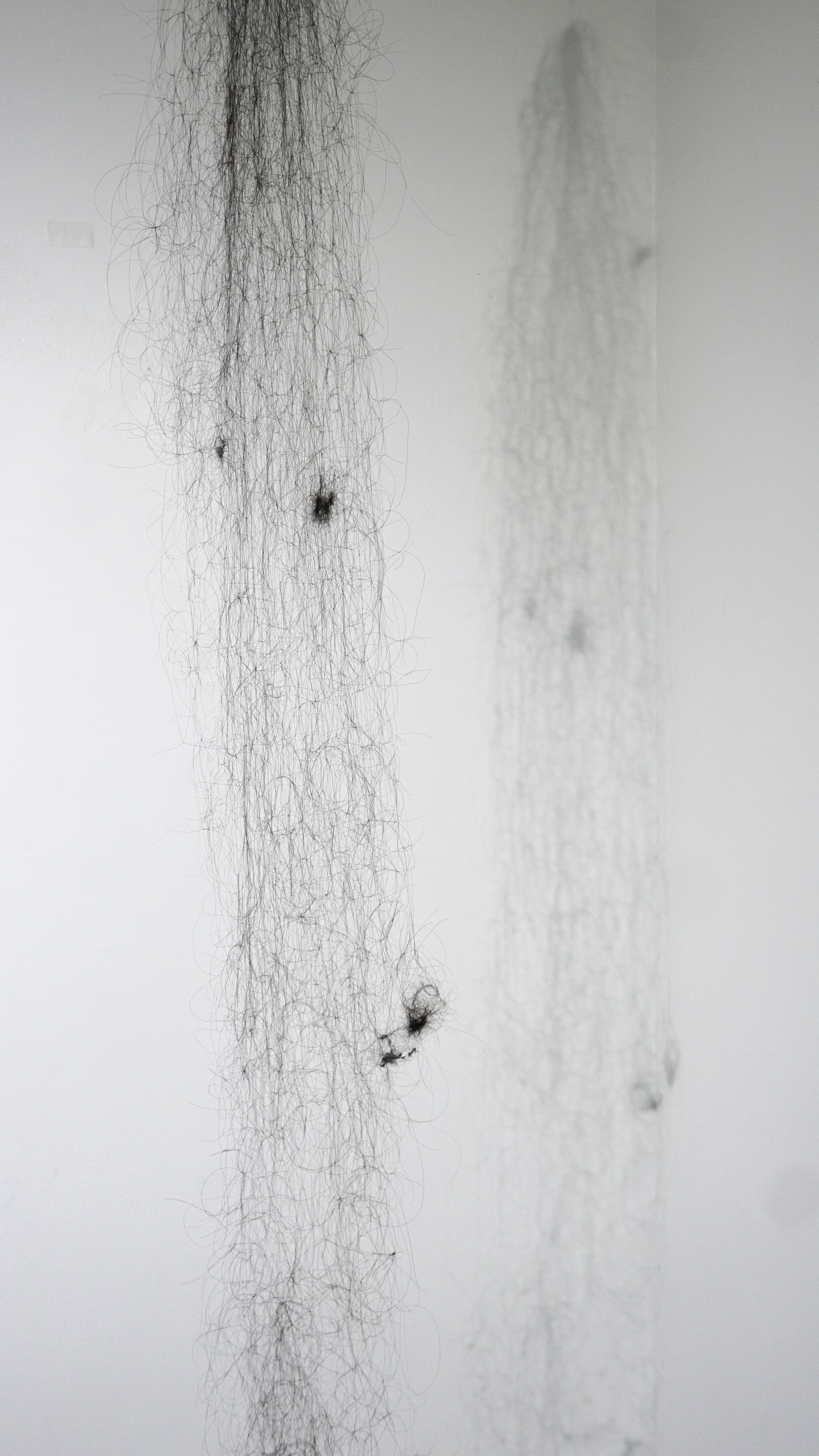 Anxiety is a universal social emotion. In Lost Ghost, I collect hair loss from different people, knot them and weave them into a web-like sculpture. I am showing the invisible sense of anxiety and uneasiness that permeates life. The privateness of a single hair tightly entwined together makes one feel sick. Lost Ghost fluctuates and changes with the wind and people approaching, like a ghost floating in the air, mapping out the erratic nature of emotions.