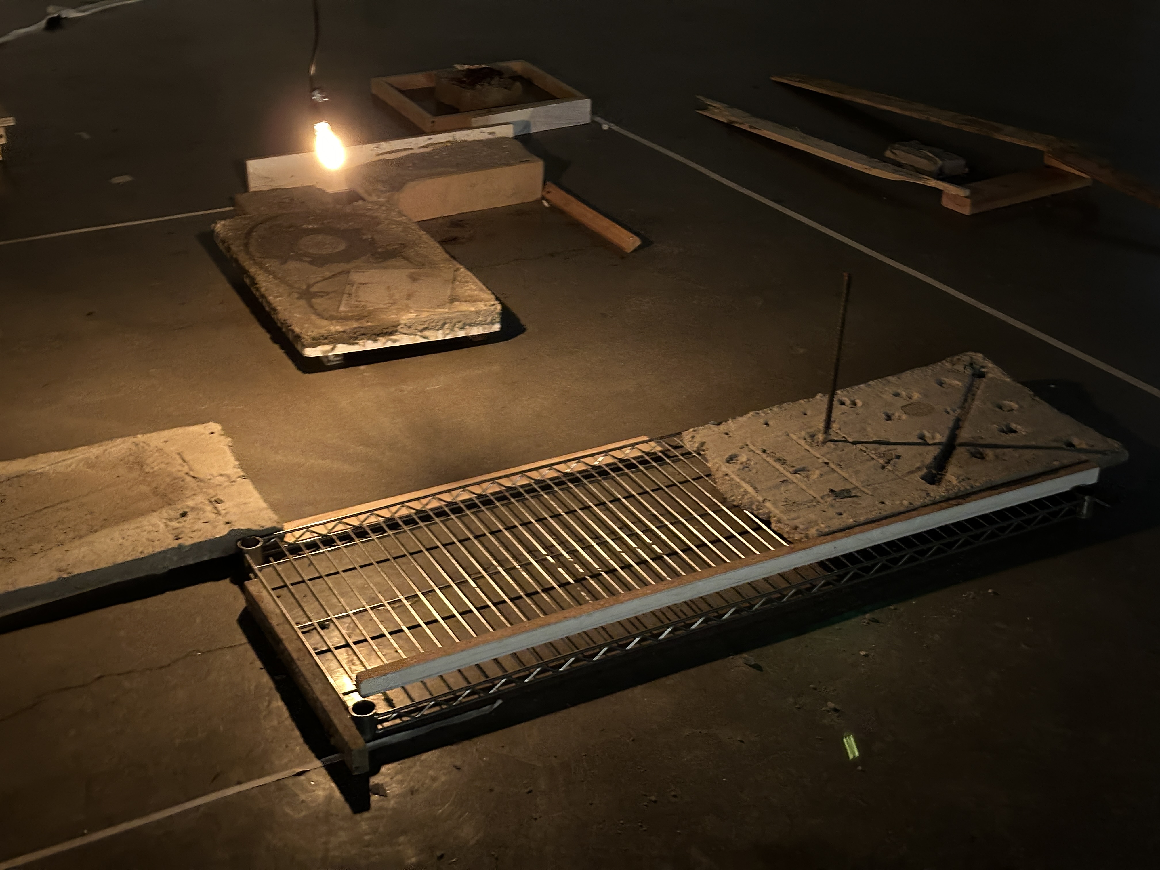 Concrete slabs bear imprints of discarded merchandise, their blurred outlines preserving the afterimages of vanished lives. Built structures, wooden boards, lines, images, and debris converge into a fragile archaeology of the present—where foundations and ruins, memory and forgetting, become indistinguishable.
